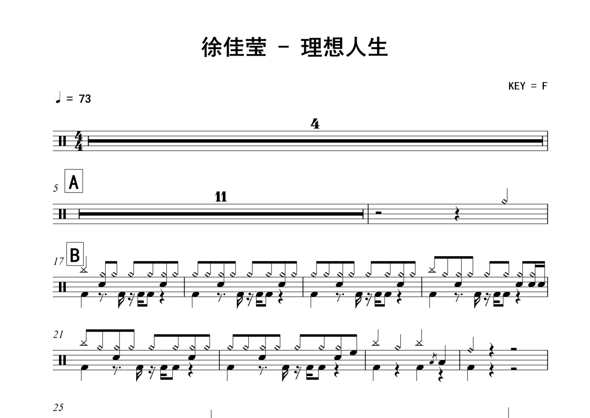 《理想人生》是徐佳莹演唱的一首歌曲,拍号为4/4拍,歌曲速度为每分钟73拍,这份架子鼓谱共有两张高清图谱,图谱由 @老虎不说谎 编配上传,图谱使用五线谱编配,使用这份理想人生架子鼓谱,你将能够轻松地敲打出这首徐佳莹的理想人生,快来尝试吧。