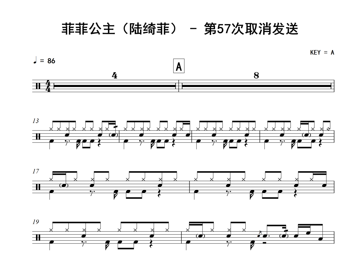 《第57次取消发送》是菲菲公主(陆绮菲)演唱的一首歌曲,拍号为4/4拍,歌曲速度为每分钟86拍,这份架子鼓谱共有两张高清图谱,图谱由 @老虎不说谎 编配上传,图谱使用五线谱编配,使用这份第57次取消发送架子鼓谱,你将能够轻松地敲打出这首菲菲公主(陆绮菲)的第57次取消发送,快来尝试吧。
