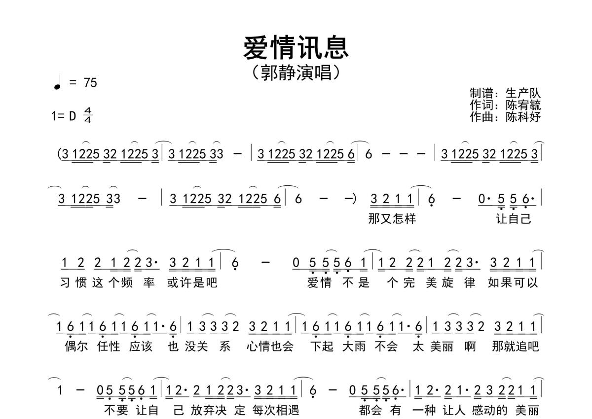 《爱情讯息》是郭静演唱的一首歌曲,原版简谱,拍号为4/4拍,歌曲速度为每分钟75拍,这份简谱共有两张高清图谱,图谱由 @生产队 编配上传郭静演唱的歌曲《爱情讯息》原版简谱,含前奏、间奏、尾奏solo编配,精编完美版,值得推荐!。