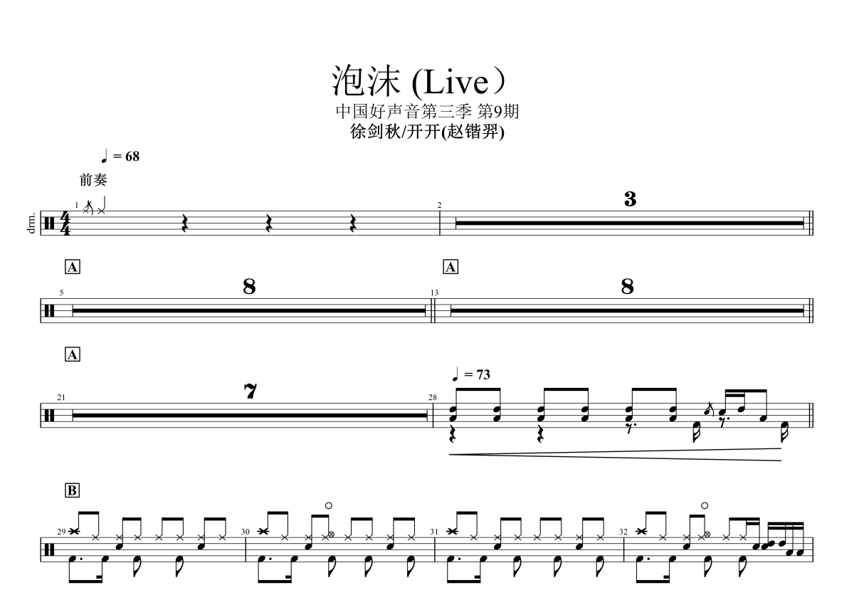 徐剑秋/开开(赵锴羿)《泡沫 (Live)》架子鼓谱