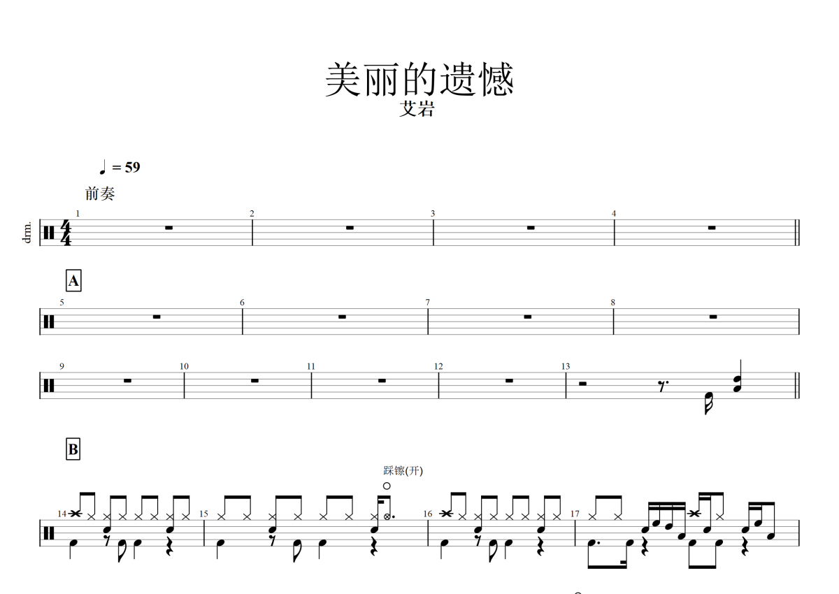 《美丽的遗憾》是艾岩演唱的一首歌曲,拍号为4/4拍,歌曲速度为每分钟59拍,这份架子鼓谱共有两张高清图谱,图谱由 @音符喷血者 编配上传,图谱使用五线谱编配,使用这份美丽的遗憾架子鼓谱,你将能够轻松地敲打出这首艾岩的美丽的遗憾,快来尝试吧。