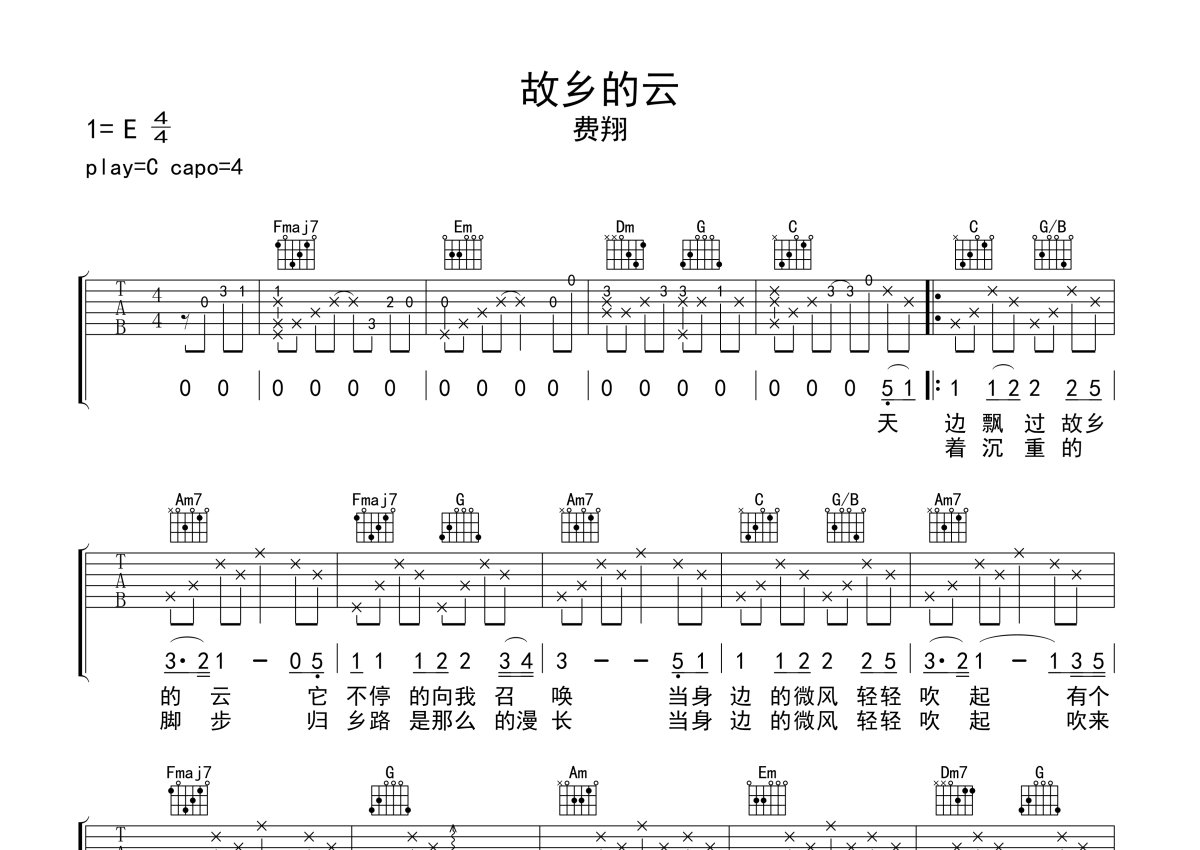 费翔《故乡的云》吉他谱 - C调弹唱六线谱