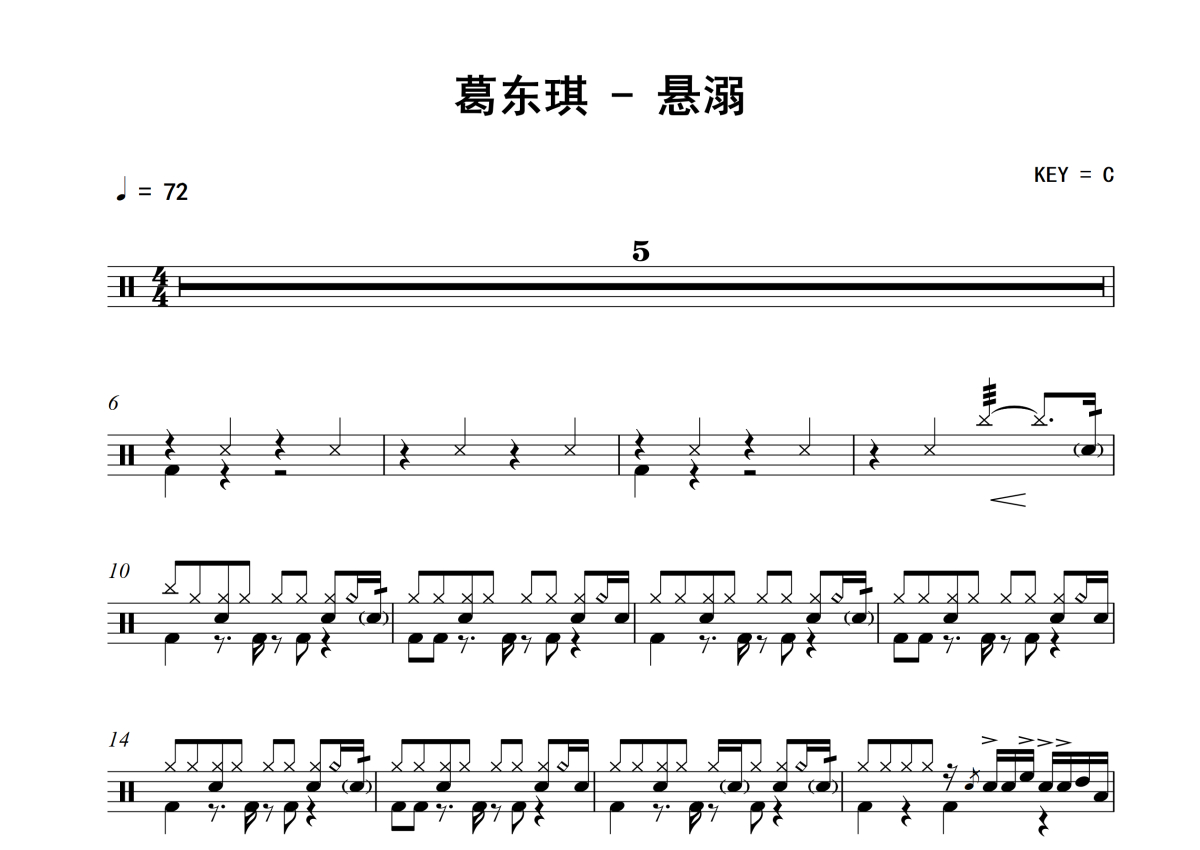 《悬溺》是葛东琪演唱的一首歌曲,拍号为4/4拍,歌曲速度为每分钟72拍,这份架子鼓谱共有两张高清图谱,图谱由 @老虎不说谎 编配上传,图谱使用五线谱编配,使用这份悬溺架子鼓谱,你将能够轻松地敲打出这首葛东琪的悬溺,快来尝试吧。