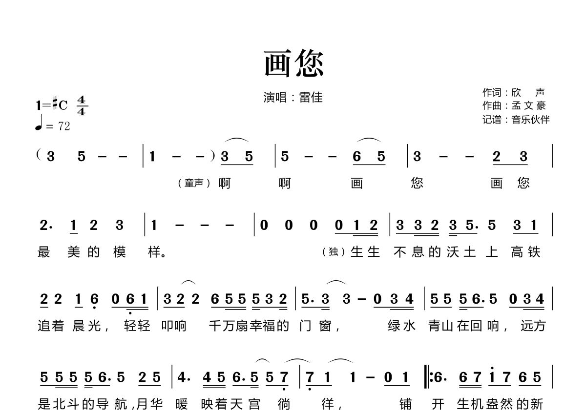 《画您》是雷佳演唱的一首歌曲,拍号为4/4拍,歌曲速度为每分钟72拍,这份简谱共有两张高清图谱,图谱由 @音乐伙伴 编配上传。