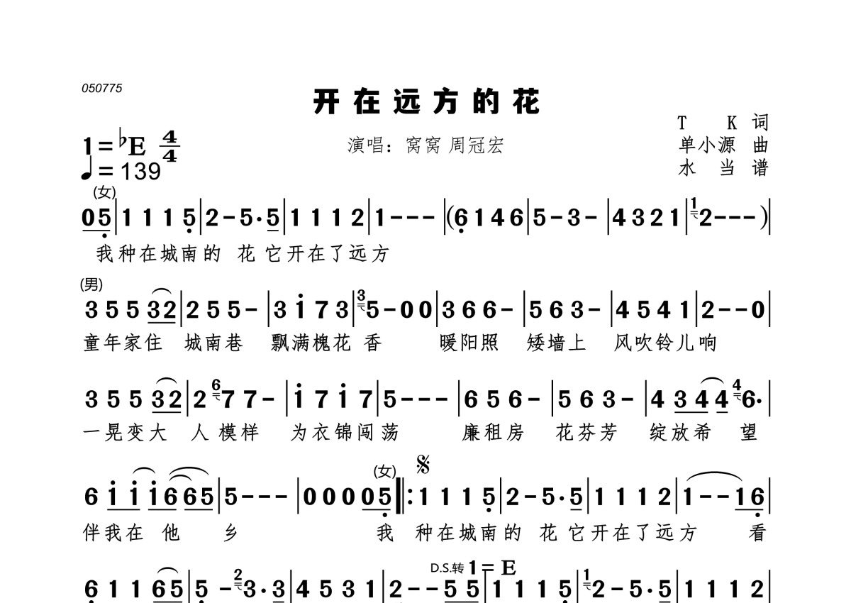 《开在远方的花》是窝窝 周冠宏演唱的一首歌曲,拍号为4/4拍,歌曲速度为每分钟139拍,这份简谱共有一张高清图谱,图谱由 @水当 编配上传。