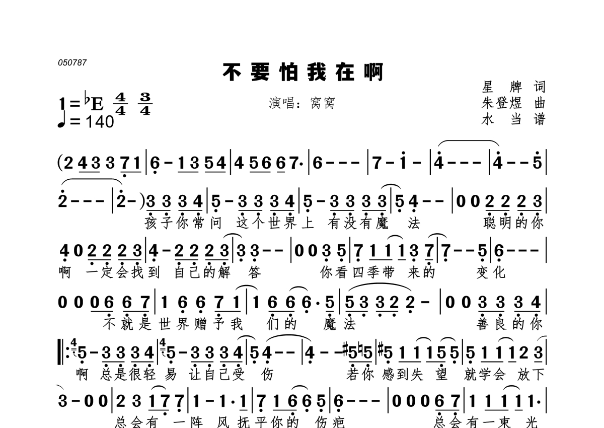 《不要怕我在啊》是窝窝演唱的一首歌曲,拍号为4/4拍,歌曲速度为每分钟140拍,这份简谱共有一张高清图谱,图谱由 @水当 编配上传。