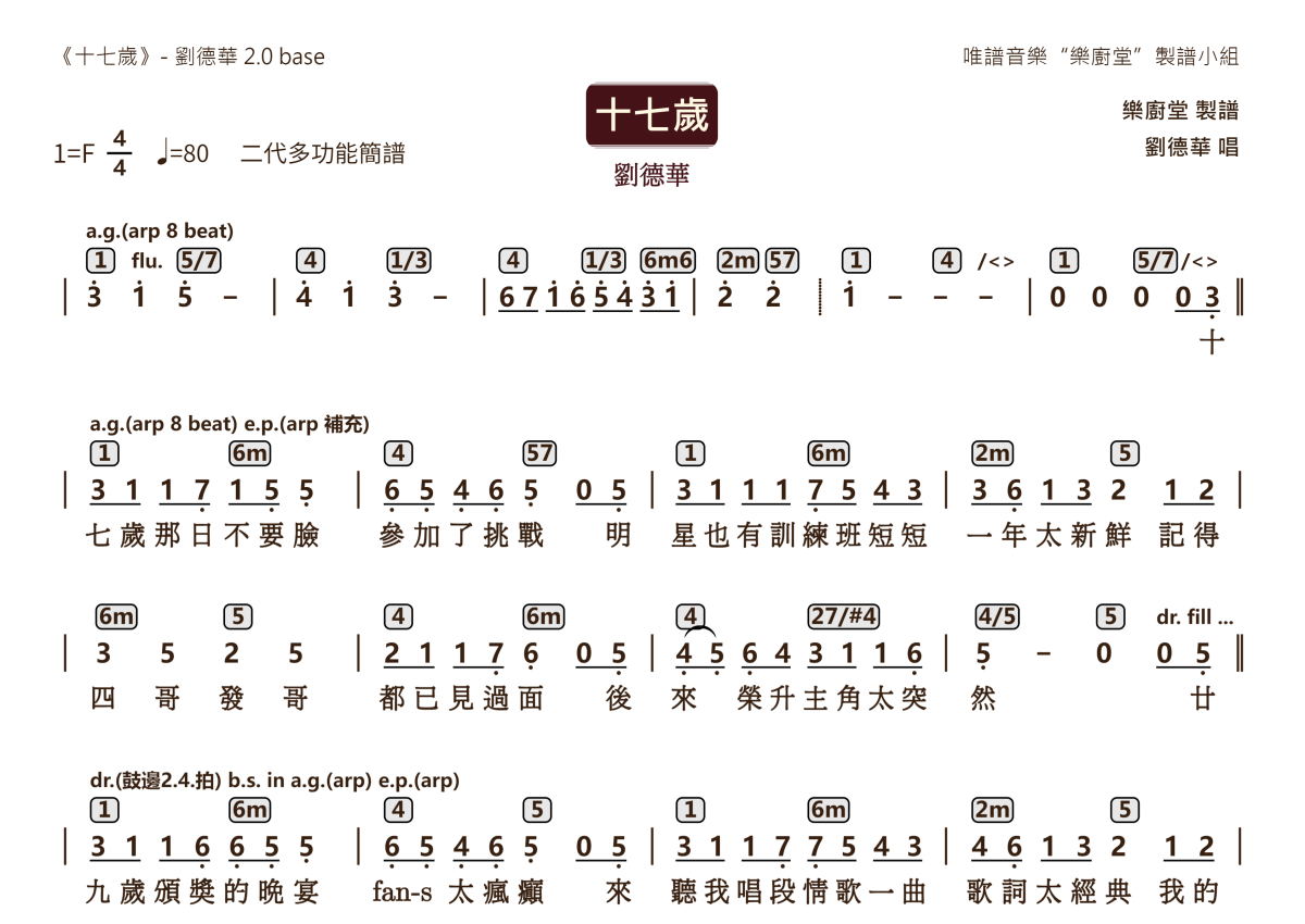 “乐厨堂”乐谱发布小组: 出版级乐谱扒谱制谱——以职业乐手圈通行标准记谱,遵循原版和声、伴奏元素和段落结构。 ❶ 2.0多功能专业团谱:采用台湾卓著公司开创的二代简谱标准制作。二代简谱无疑是迄今为止最科学、最易读的专业范畴多功能记谱方案:❷ 框架谱:采用职业乐手通常记谱方案制作。