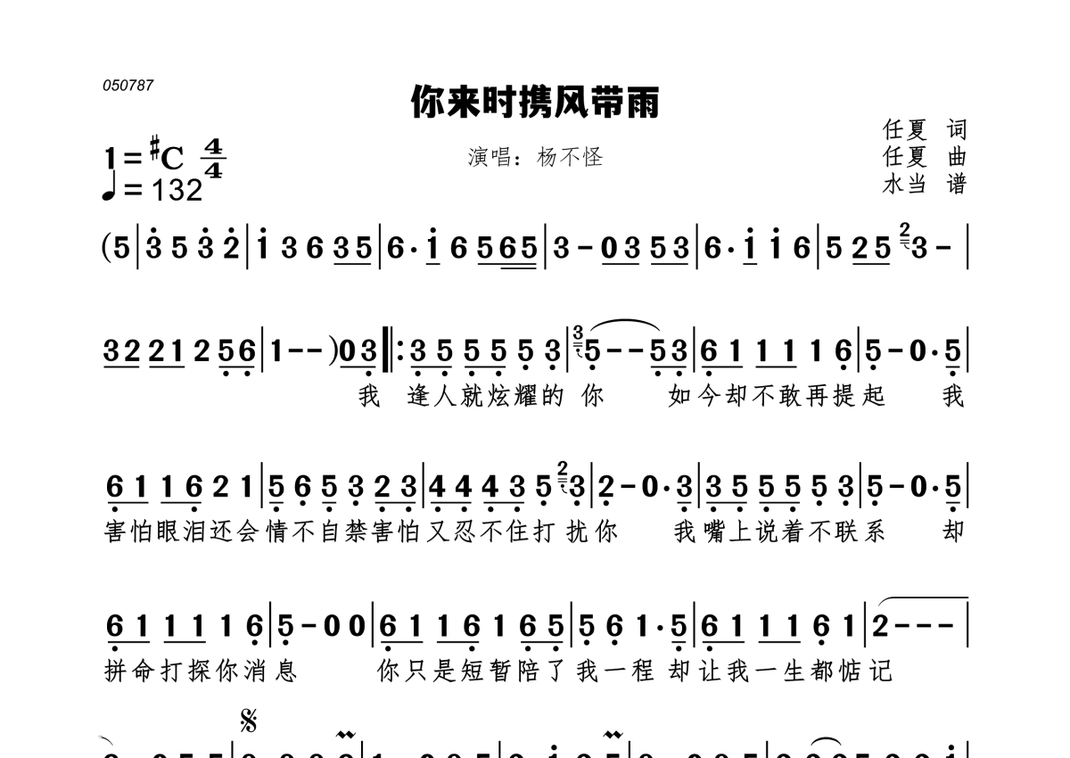 你来时携风带雨简谱 - 杨不乖演唱