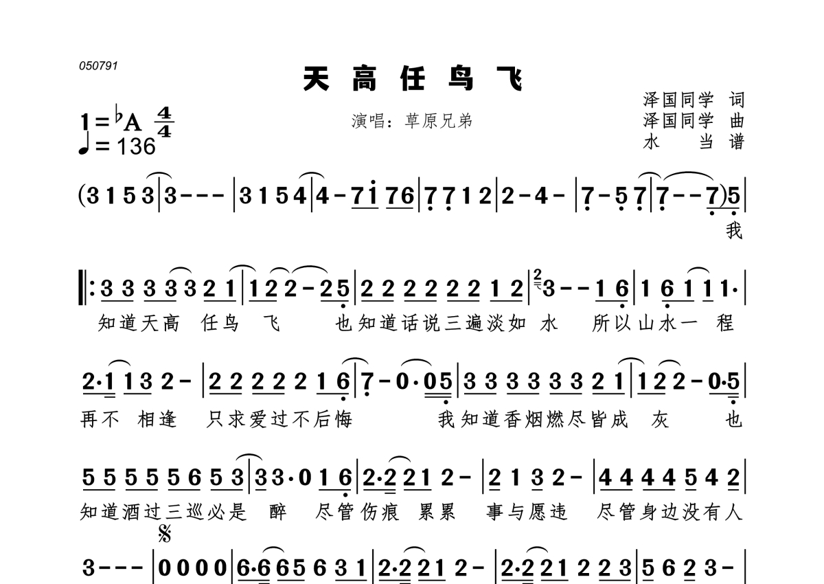 《天高任鸟飞》是草原兄弟演唱的一首歌曲,拍号为4/4拍,歌曲速度为每分钟136拍,这份简谱共有一张高清图谱,图谱由 @水当 编配上传。