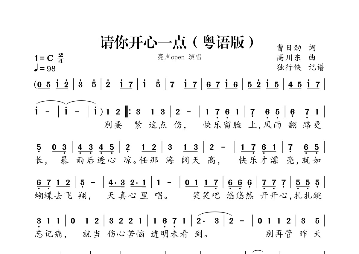 《请你开心一点》是亮声open演唱的一首歌曲,粤语版,拍号为2/4拍,歌曲速度为每分钟98拍,这份简谱共有一张高清图谱,图谱由 @独行侠 编配上传。