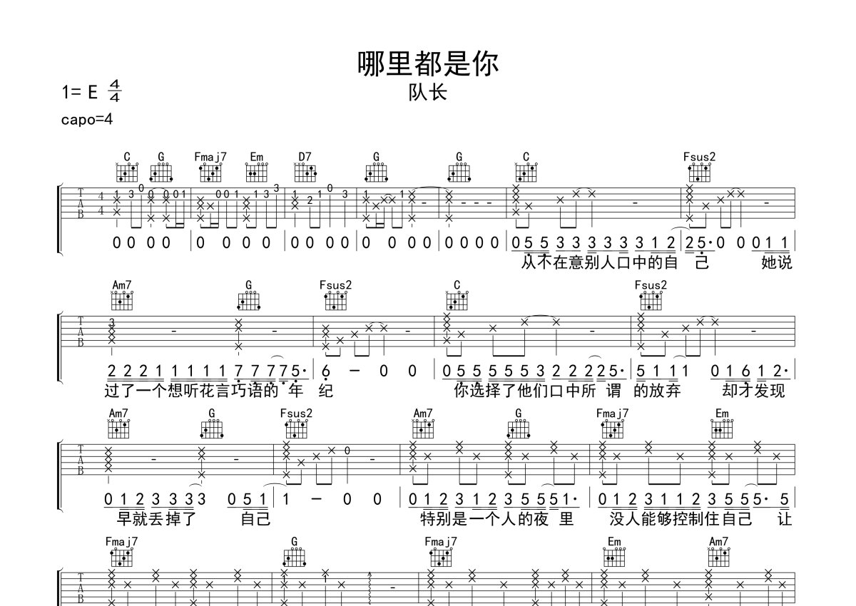 队长《哪里都是你》吉他谱 - C调弹唱六线谱 - 双页免翻页版