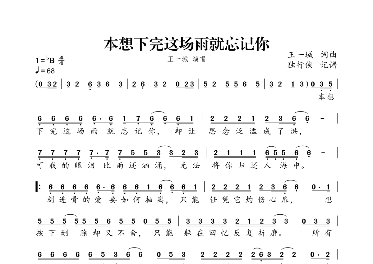 《本想下完这场雨就忘记你》是王一城演唱的一首歌曲,拍号为4/4拍,歌曲速度为每分钟68拍,这份简谱共有一张高清图谱,图谱由 @独行侠 编配上传。
