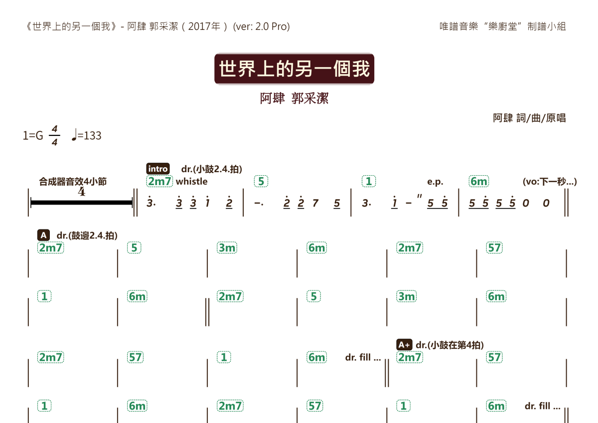 “乐厨堂”乐谱发布小组: 出版级乐谱扒谱制谱——以职业乐手圈通行标准记谱,遵循原版和声、伴奏元素和段落结构。 ❶ 2.0多功能专业团谱:采用台湾卓著公司开创的二代简谱标准制作。二代简谱无疑是迄今为止最科学、最易读的专业范畴多功能记谱方案:❷ 框架谱:采用职业乐手通常记谱方案制作。