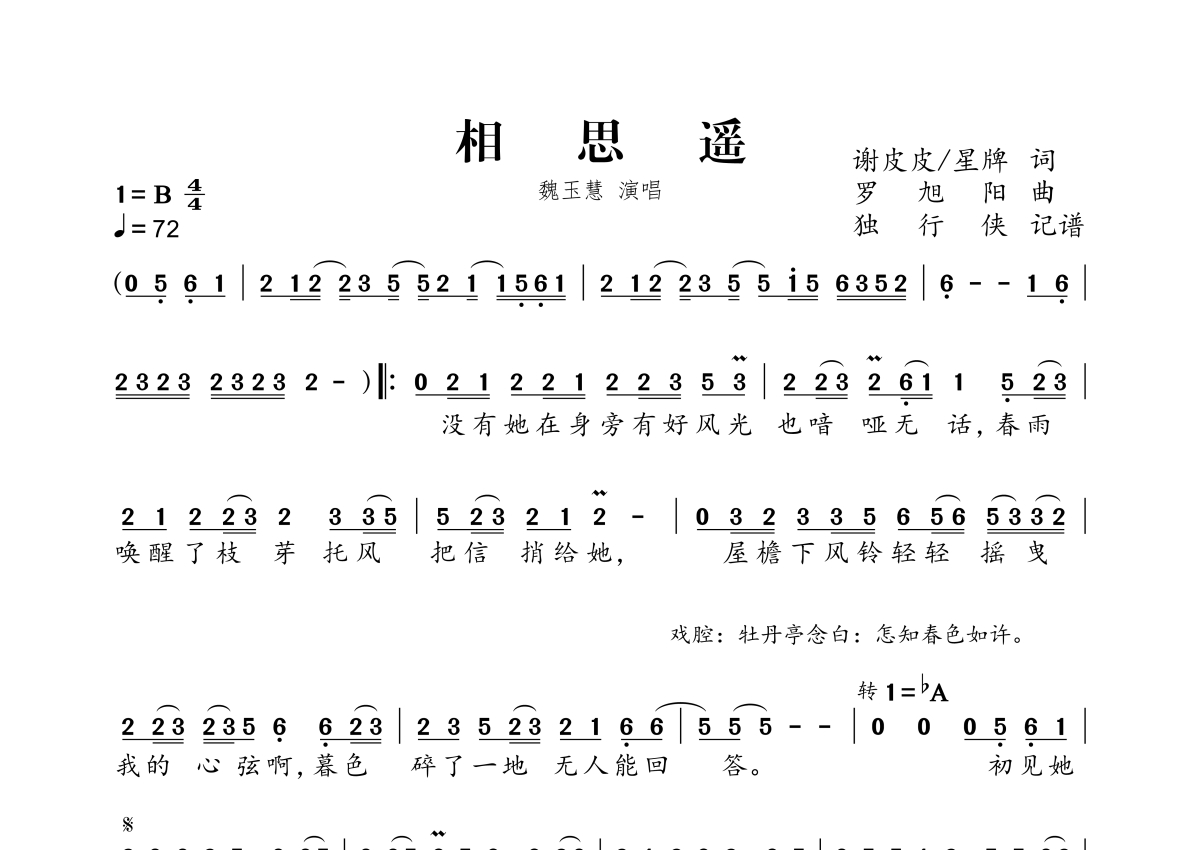 《相思遥》是魏玉慧演唱的一首歌曲,拍号为4/4拍,歌曲速度为每分钟72拍,这份简谱共有一张高清图谱,图谱由 @独行侠 编配上传。