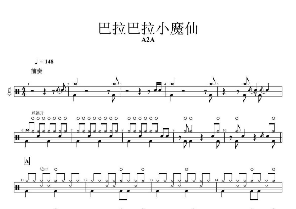 《巴拉巴拉小魔仙》是A2A演唱的一首歌曲,拍号为4/4拍,歌曲速度为每分钟148拍,这份架子鼓谱共有四张高清图谱,图谱由 @音符喷血者 编配上传,图谱使用五线谱编配,使用这份巴拉巴拉小魔仙架子鼓谱,你将能够轻松地敲打出这首A2A的巴拉巴拉小魔仙,快来尝试吧。
