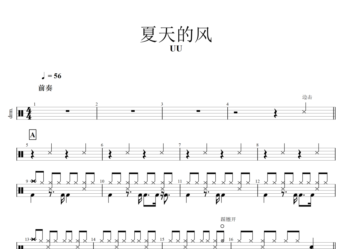 《夏天的风》是Uu(刘梦妤)演唱的一首歌曲,拍号为4/4拍,歌曲速度为每分钟56拍,这份架子鼓谱共有两张高清图谱,图谱由 @音符喷血者 编配上传,图谱使用五线谱编配,使用这份夏天的风架子鼓谱,你将能够轻松地敲打出这首Uu(刘梦妤)的夏天的风,快来尝试吧。
