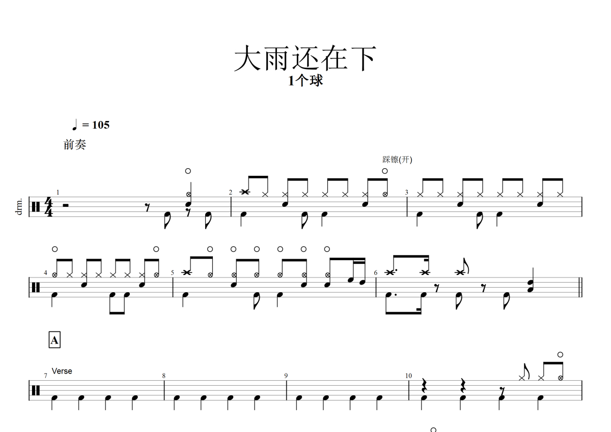 《大雨还在下》是1个球演唱的一首歌曲,拍号为4/4拍,歌曲速度为每分钟105拍,这份架子鼓谱共有三张高清图谱,图谱由 @音符喷血者 编配上传,图谱使用五线谱编配,使用这份大雨还在下架子鼓谱,你将能够轻松地敲打出这首1个球的大雨还在下,快来尝试吧。
