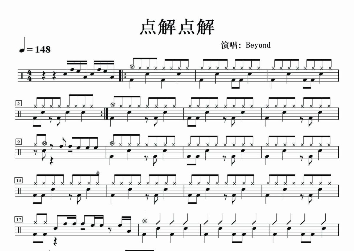 《点解点解》是Beyond演唱的一首歌曲,拍号为4/4拍,歌曲速度为每分钟148拍,这份架子鼓谱共有三张高清图谱,图谱由 @音符喷血者 编配上传,图谱使用五线谱编配,使用这份点解点解架子鼓谱,你将能够轻松地敲打出这首Beyond的点解点解,快来尝试吧。