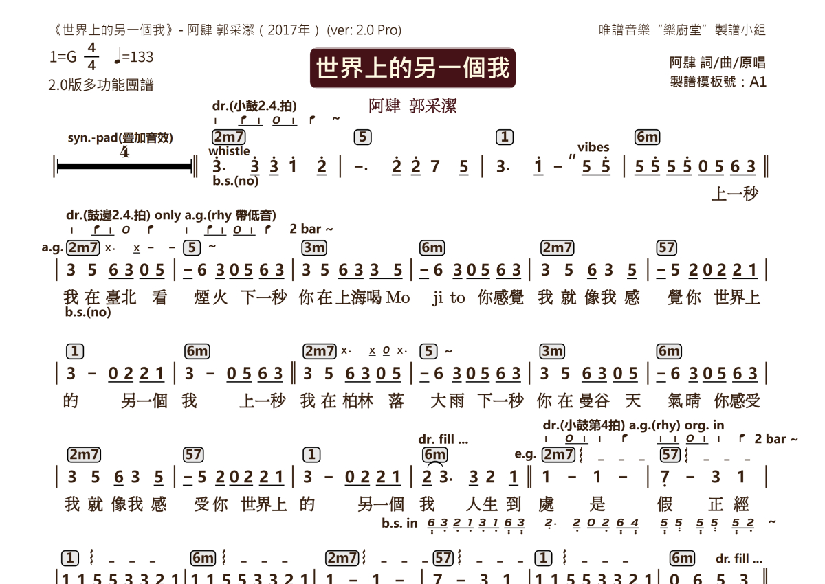阿肆 郭采洁《世界上的另一个我》乐队总谱 - 2.0版多功能团谱