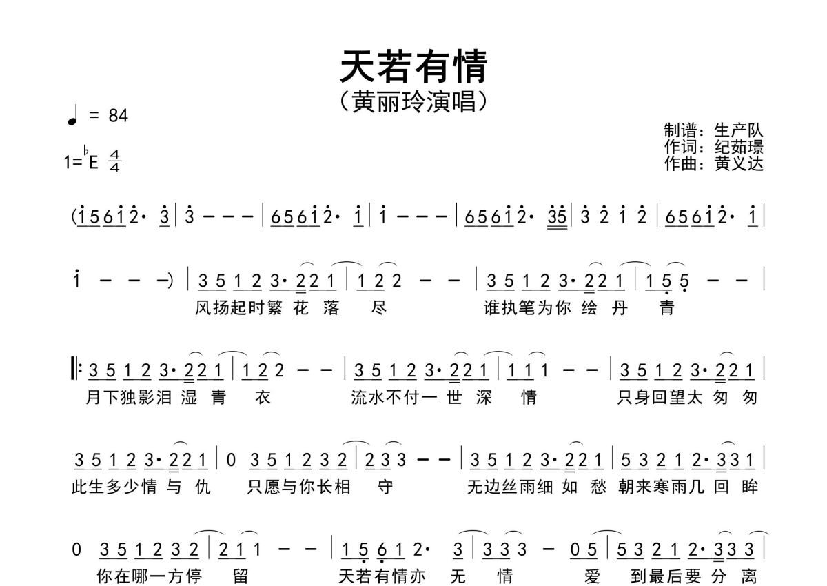 《天若有情》是黄丽玲演唱的一首歌曲,原版简谱,拍号为4/4拍,歌曲速度为每分钟84拍,这份简谱共有一张高清图谱,图谱由 @生产队 编配上传黄丽玲演唱的电视剧《锦绣未央》主题曲《天若有情》原版简谱,完整的前奏、间奏、尾奏solo编配,精编完美版,值得推荐!。