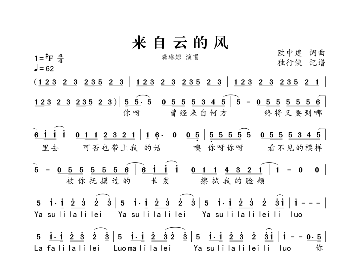 来自云的风简谱 - 龚琳娜演唱