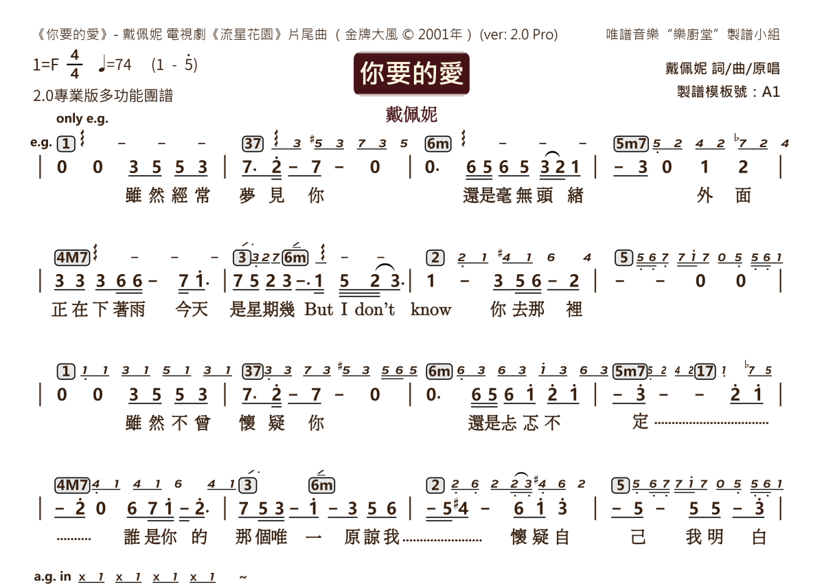 “乐厨堂”乐谱发布小组: 出版级乐谱扒谱制谱——以职业乐手圈通行标准记谱,遵循原版和声、伴奏元素和段落结构。 ❶ 2.0多功能专业团谱:采用台湾卓著公司开创的二代简谱标准制作。二代简谱无疑是迄今为止最科学、最易读的专业范畴多功能记谱方案:❷ 框架谱:采用职业乐手通常记谱方案制作。