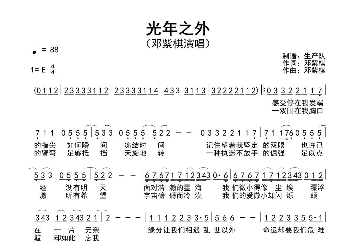 《光年之外》是邓紫棋演唱的一首歌曲,原版简谱,拍号为4/4拍,歌曲速度为每分钟88拍,这份简谱共有一张高清图谱,图谱由 @生产队 编配上传邓紫棋演唱的歌曲《光年之外》原版简谱,该曲是电影《太空旅客》中国区主题曲,精编完美版,值得推荐!。
