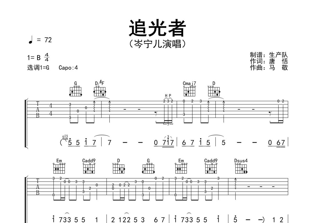 《追光者》是岑宁儿演唱的一首歌曲,精编完美版,拍号为4/4拍,歌曲速度为每分钟72拍,歌曲原调为B调,但由于原调指法比较难,为了方便弹奏,本吉他谱采用的是G调指法编配,变调夹4品弹奏即为原调,当然也可以根据自己的音域改变变调夹位置,或者通过改变和弦调性,以方便自己弹奏,这份吉他谱共有三张高清图谱,图谱由 @生产队 编配上传,图谱使用六线谱编配,包含吉他和弦指法、简谱以及歌词部分,使用这份追光者吉他谱,可以让你更加方便地掌握这首歌曲的弹唱技巧,快来尝试吧。岑宁儿演唱的歌曲《追光者》原版吉他谱,《追光者》是电视剧《夏至未至》的插曲,本吉他谱为精编完美版,怀旧经典!。