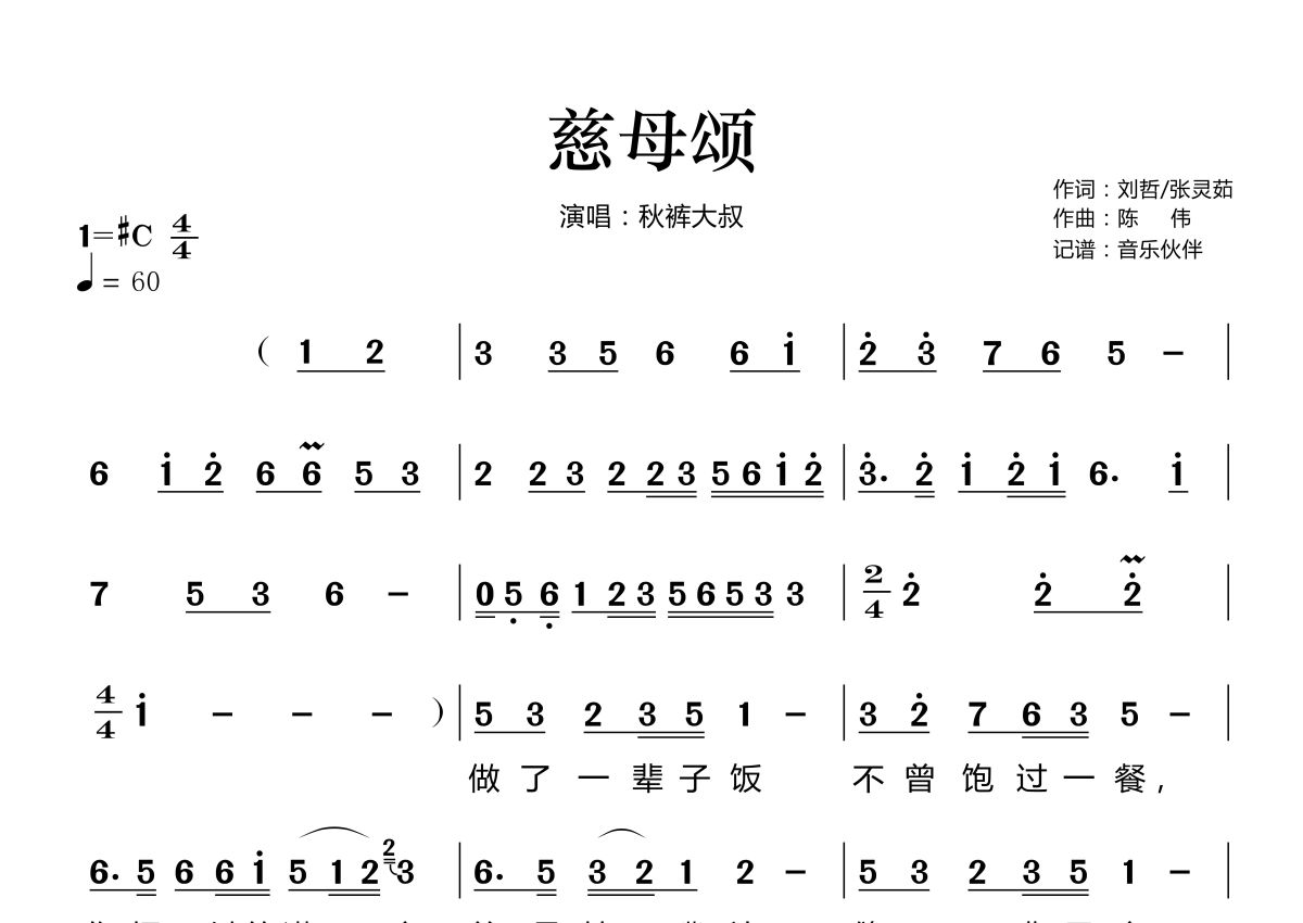 《慈母颂》是秋裤大叔演唱的一首歌曲,拍号为4/4拍,歌曲速度为每分钟60拍,这份简谱共有两张高清图谱,图谱由 @音乐伙伴 编配上传。