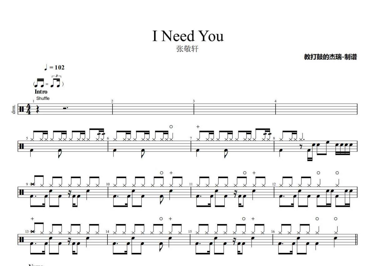 《I Need You》是张敬轩演唱的一首歌曲,拍号为4/4拍,歌曲速度为每分钟102拍,这份架子鼓谱共有三张高清图谱,图谱由 @Jerry 编配上传,图谱使用五线谱编配,使用这份I Need You架子鼓谱,你将能够轻松地敲打出这首张敬轩的I Need You,快来尝试吧。