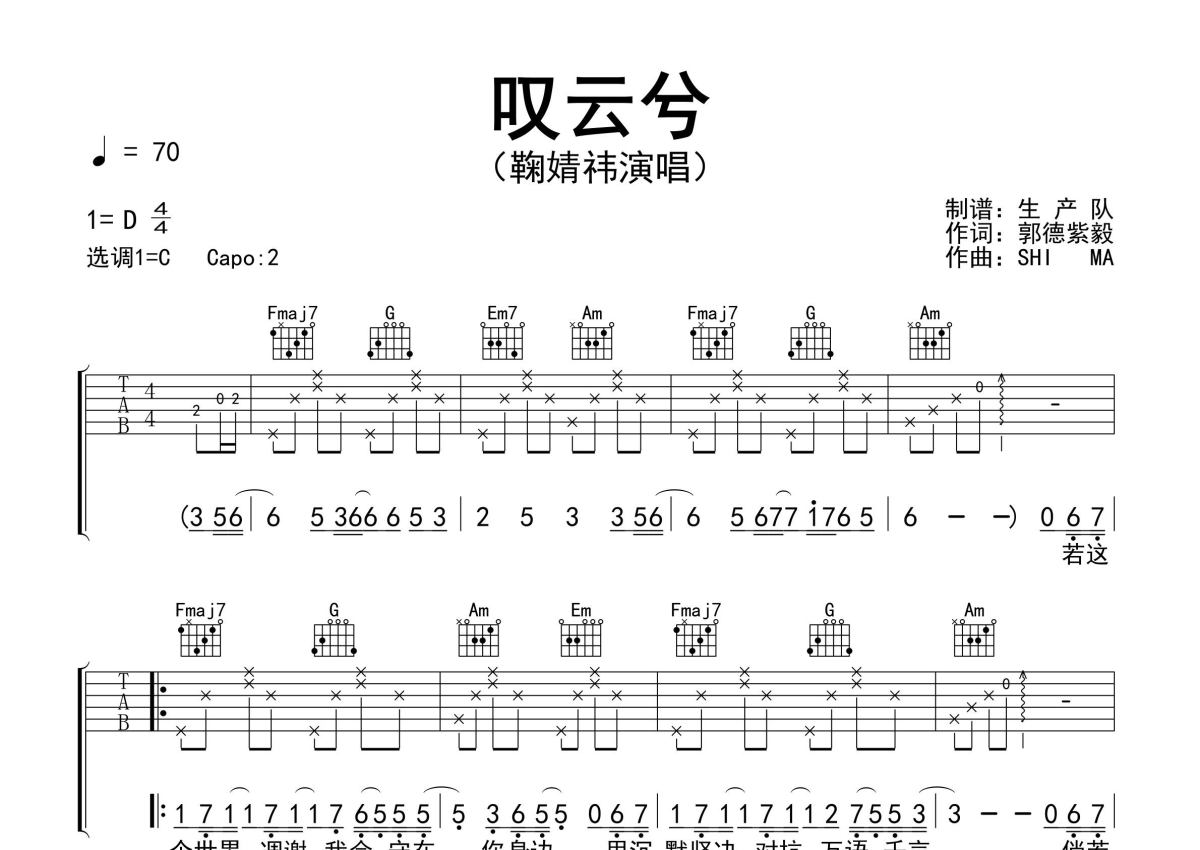 《叹云兮》是鞠婧祎演唱的一首歌曲,精编完美版,拍号为4/4拍,歌曲速度为每分钟70拍,歌曲原调为D调,但由于原调指法比较难,为了方便弹奏,本吉他谱采用的是C调指法编配,变调夹2品弹奏即为原调,当然也可以根据自己的音域改变变调夹位置,或者通过改变和弦调性,以方便自己弹奏,这份吉他谱共有三张高清图谱,图谱由 @生产队 编配上传,图谱使用六线谱编配,包含吉他和弦指法、简谱以及歌词部分,使用这份叹云兮吉他谱,可以让你更加方便地掌握这首歌曲的弹唱技巧,快来尝试吧。鞠婧祎演唱的歌曲《叹云兮》原版吉他谱,含前奏、间奏、尾奏solo编配,精编完美版。《叹云兮》是古装剧《芸汐传》的片尾曲,值得推荐!。