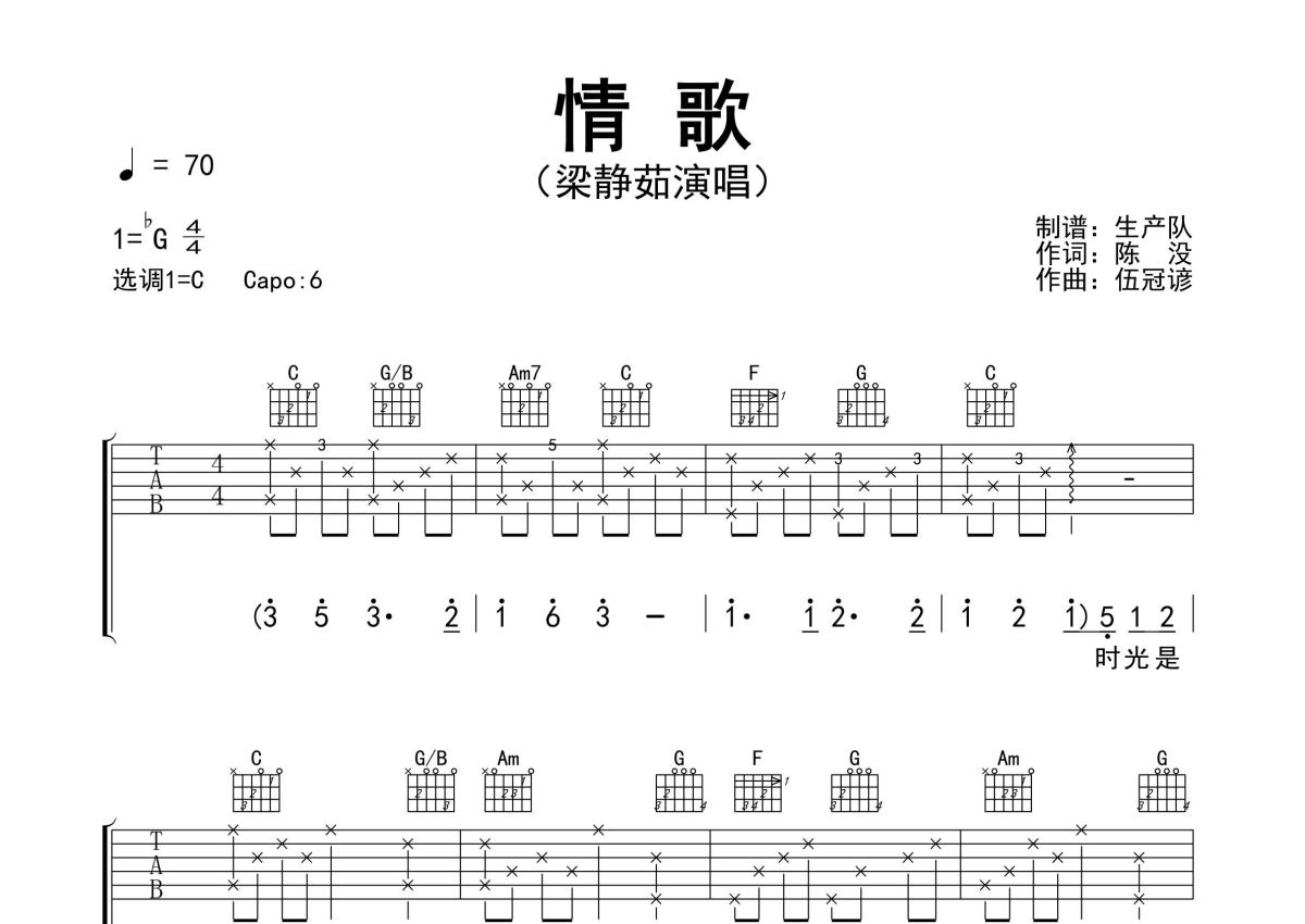 《情歌》是梁静茹演唱的一首歌曲,精编完美版,拍号为4/4拍,歌曲速度为每分钟70拍,歌曲原调为Gb调,但由于原调指法比较难,为了方便弹奏,本吉他谱采用的是C调指法编配,变调夹6品弹奏即为原调,当然也可以根据自己的音域改变变调夹位置,或者通过改变和弦调性,以方便自己弹奏,这份吉他谱共有三张高清图谱,图谱由 @生产队 编配上传,图谱使用六线谱编配,包含吉他和弦指法、简谱以及歌词部分,使用这份情歌吉他谱,可以让你更加方便地掌握这首歌曲的弹唱技巧,快来尝试吧。梁静茹演唱的歌曲《情歌》原版吉他谱,精准的前奏、间奏、尾奏solo编配,精编完美版。该曲同时也是台湾青春偶像剧《败犬女王》的插曲,怀旧经典!。