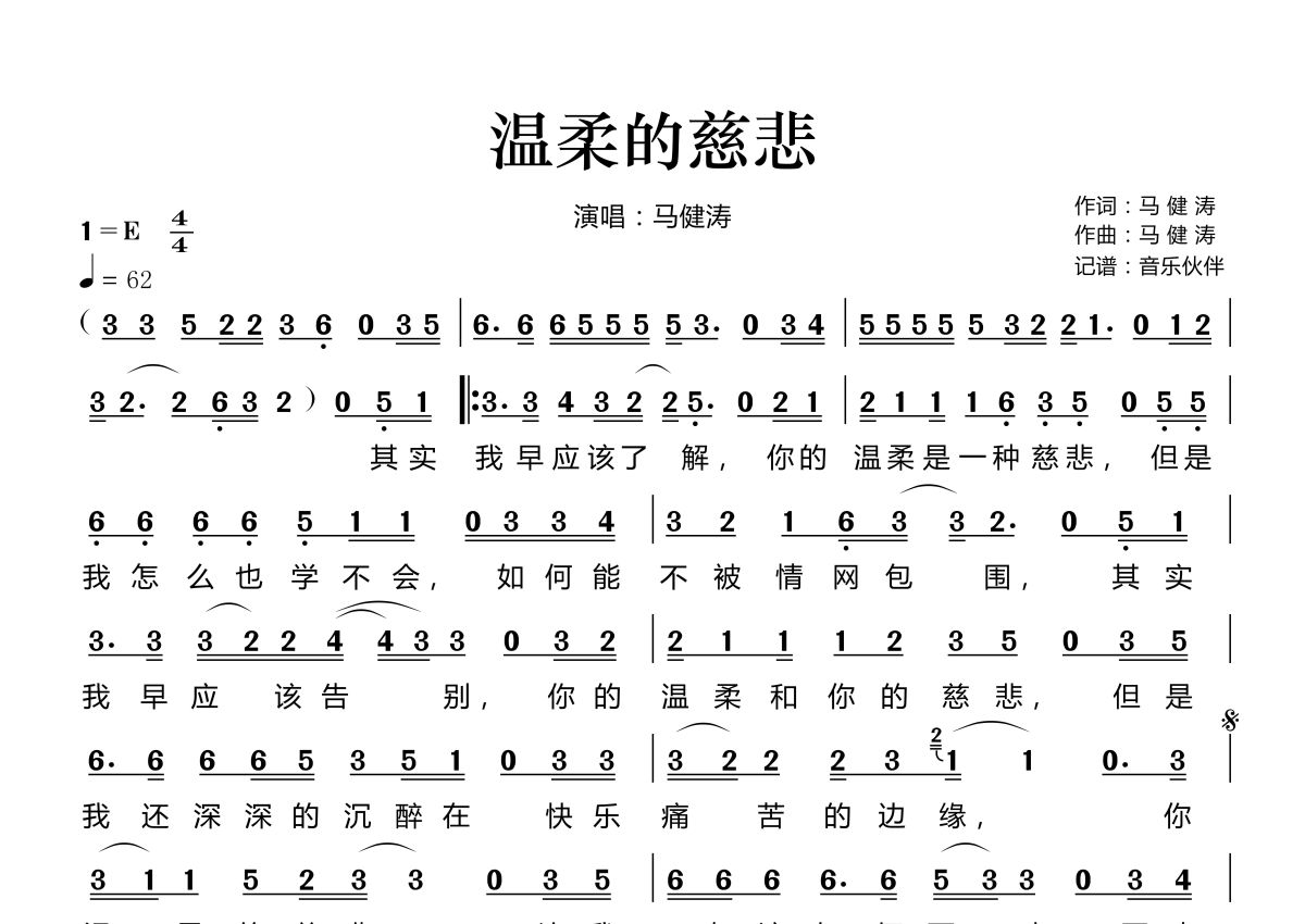 温柔的慈悲简谱 - 马健涛演唱