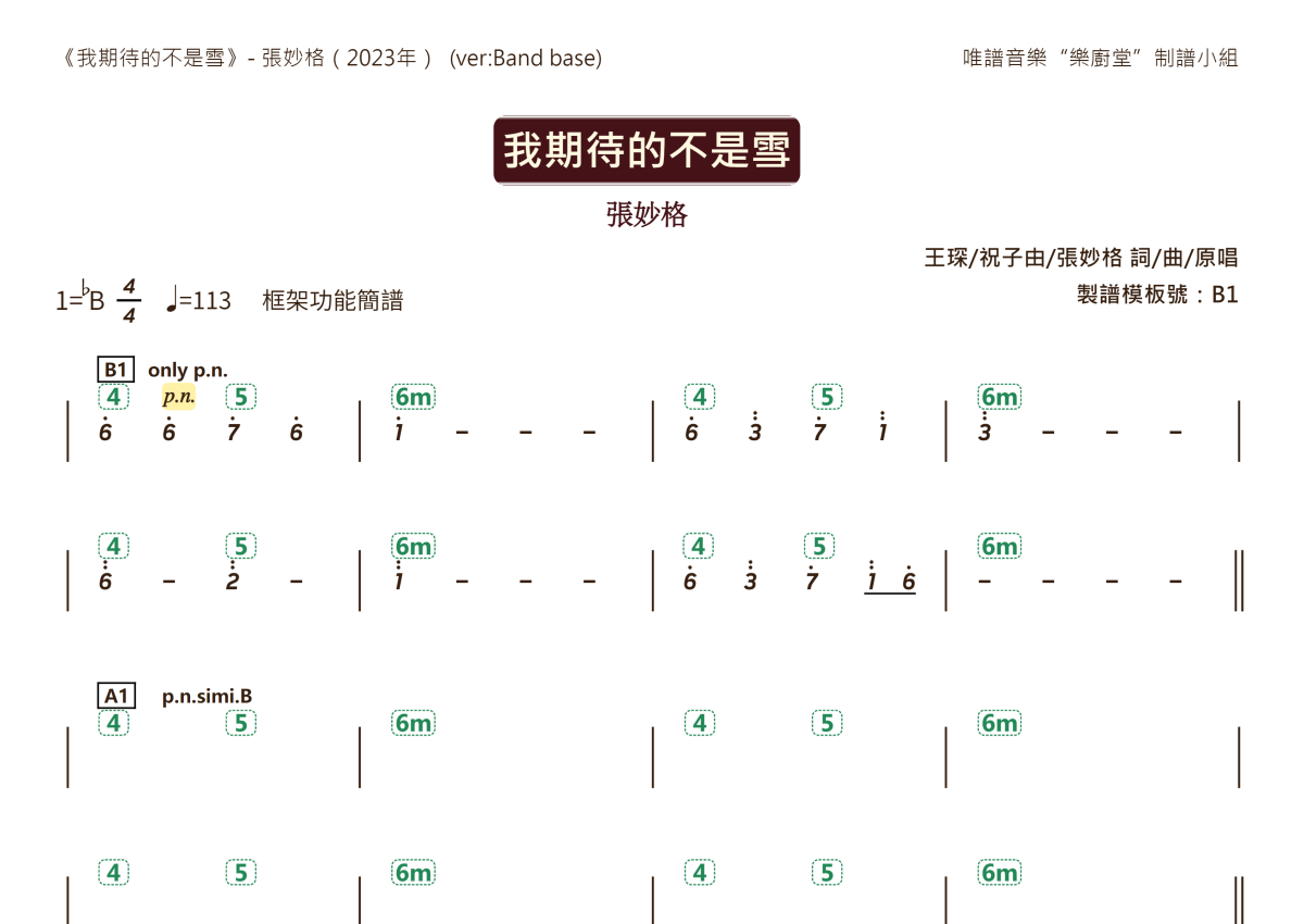 《我期待的不是雪》是张妙格演唱的一首歌曲,框架功能谱,这份乐队总谱共有两张高清图谱,图谱由 @唯谱音乐"乐厨堂"发布小组 编配上传。