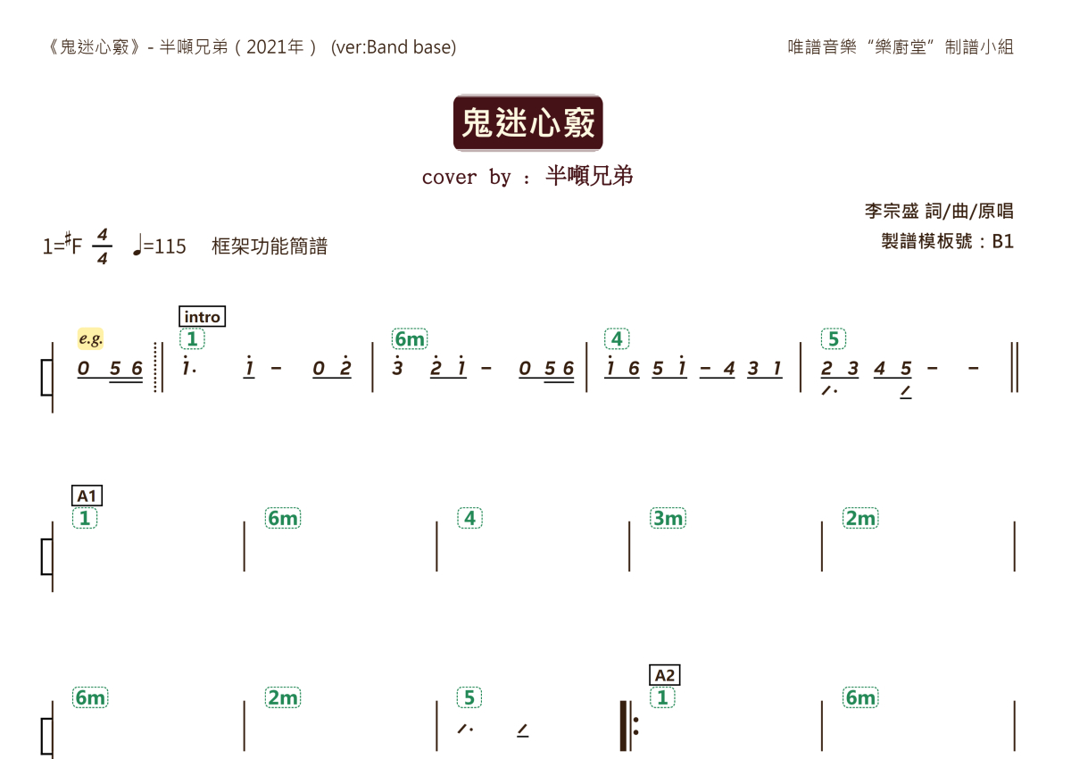 “乐厨堂”乐谱发布小组: 出版级乐谱扒谱制谱——以职业乐手圈通行标准记谱,遵循原版和声、伴奏元素和段落结构。 ❶ 2.0多功能专业团谱:采用台湾卓著公司开创的二代简谱标准制作。二代简谱无疑是迄今为止最科学、最易读的专业范畴多功能记谱方案:❷ 框架谱:采用职业乐手通常记谱方案制作。
