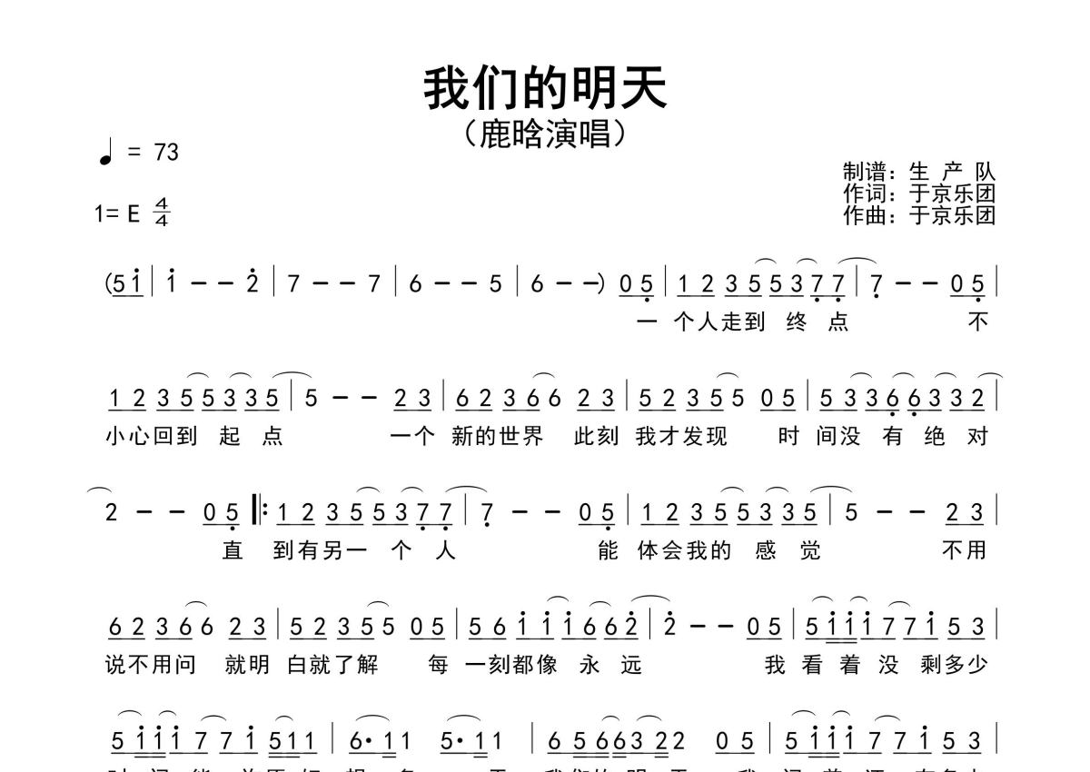 《我们的明天》是鹿晗演唱的一首歌曲,原版简谱,拍号为4/4拍,歌曲速度为每分钟73拍,这份简谱共有一张高清图谱,图谱由 @生产队 编配上传鹿晗演唱的歌曲《我们的明天》原版简谱,精准的前奏、间奏solo编配,精编完美版。该曲亦是电影《重返20岁》的主题曲,怀旧经典!。