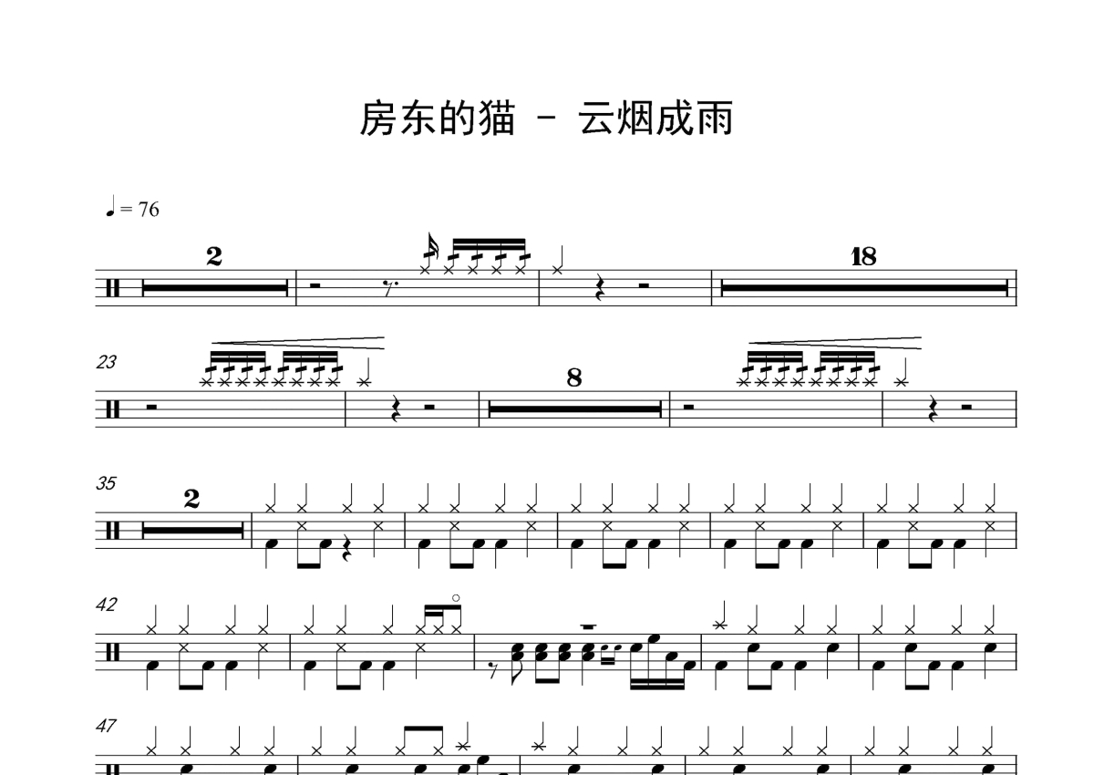 《云烟成雨》是房东的猫演唱的一首歌曲,拍号为4/4拍,歌曲速度为每分钟76拍,这份架子鼓谱共有一张高清图谱,图谱由 @音符喷血者 编配上传,图谱使用五线谱编配,使用这份云烟成雨架子鼓谱,你将能够轻松地敲打出这首房东的猫的云烟成雨,快来尝试吧。