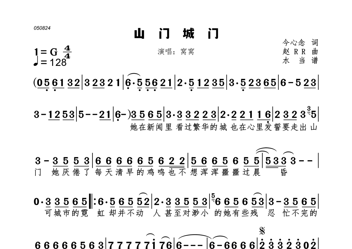 《山门城门》是窝窝演唱的一首歌曲,拍号为4/4拍,歌曲速度为每分钟128拍,这份简谱共有一张高清图谱,图谱由 @水当 编配上传。
