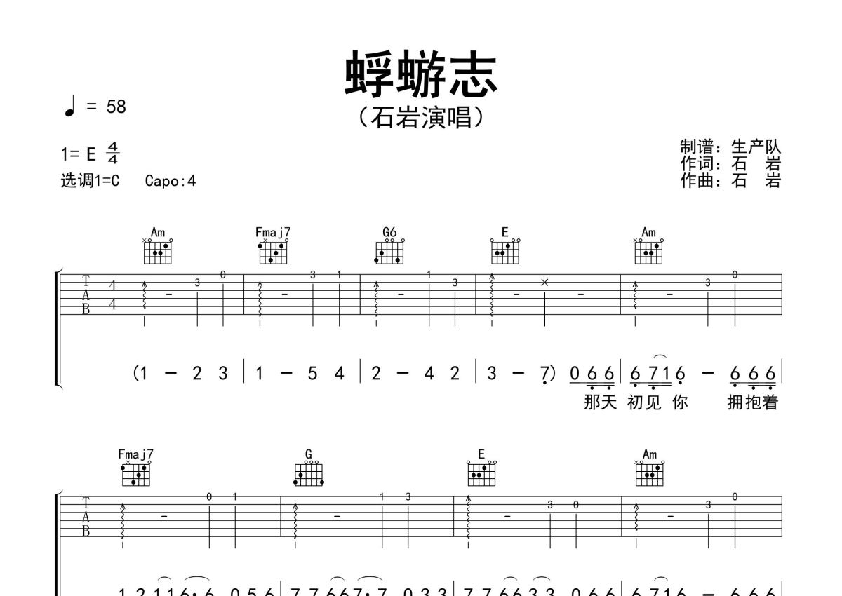 《蜉蝣志》是石岩演唱的一首歌曲,精编完美版,拍号为4/4拍,歌曲速度为每分钟58拍,歌曲原调为E调,但由于原调指法比较难,为了方便弹奏,本吉他谱采用的是C调指法编配,变调夹4品弹奏即为原调,当然也可以根据自己的音域改变变调夹位置,或者通过改变和弦调性,以方便自己弹奏,这份吉他谱共有三张高清图谱,图谱由 @生产队 编配上传,图谱使用六线谱编配,包含吉他和弦指法、简谱以及歌词部分,使用这份蜉蝣志吉他谱,可以让你更加方便地掌握这首歌曲的弹唱技巧,快来尝试吧。石岩演唱的歌曲《蜉蝣志》原版吉他谱,精准的前奏、间奏、尾奏solo编配,精编完美版。该曲也是电视剧《凡人修仙传》插曲,值得推荐!。