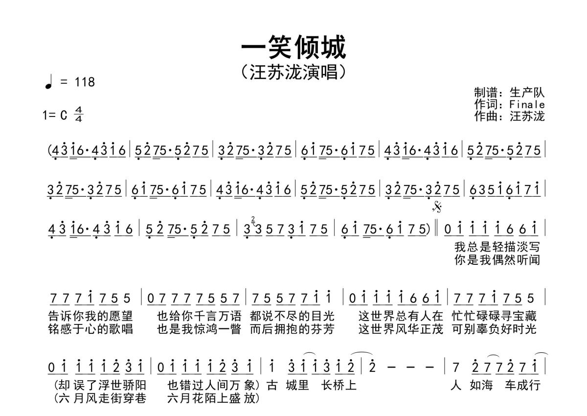 《一笑倾城》是汪苏泷演唱的一首歌曲,原版简谱,拍号为4/4拍,歌曲速度为每分钟118拍,这份简谱共有一张高清图谱,图谱由 @生产队 编配上传汪苏泷演唱的歌曲《一笑倾城》原版简谱,精准的前奏、间奏、尾奏solo编配,精编拍弦版。该曲也是电视剧《微微一笑很倾城》的片头曲、推广曲,怀旧经典!。
