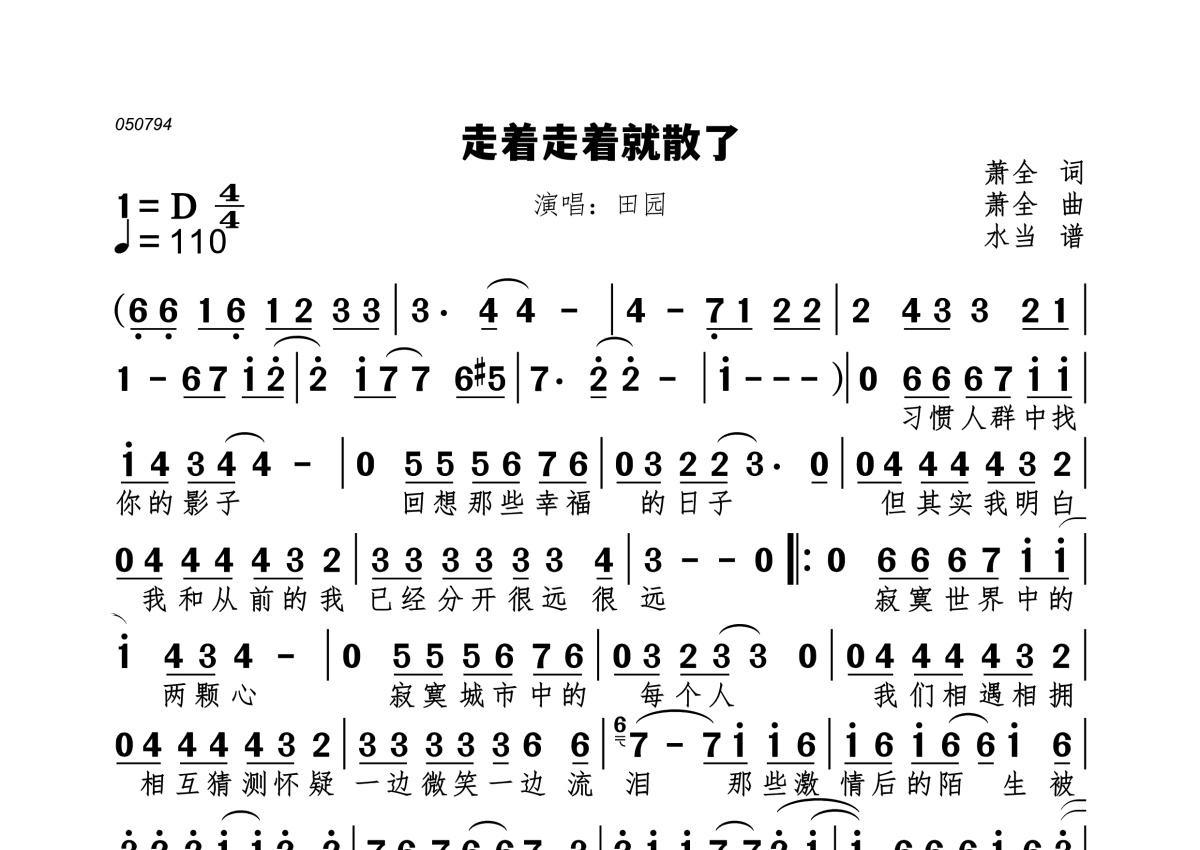 《走着走着就散了》是田园演唱的一首歌曲,拍号为4/4拍,歌曲速度为每分钟110拍,这份简谱共有一张高清图谱,图谱由 @水当 编配上传。