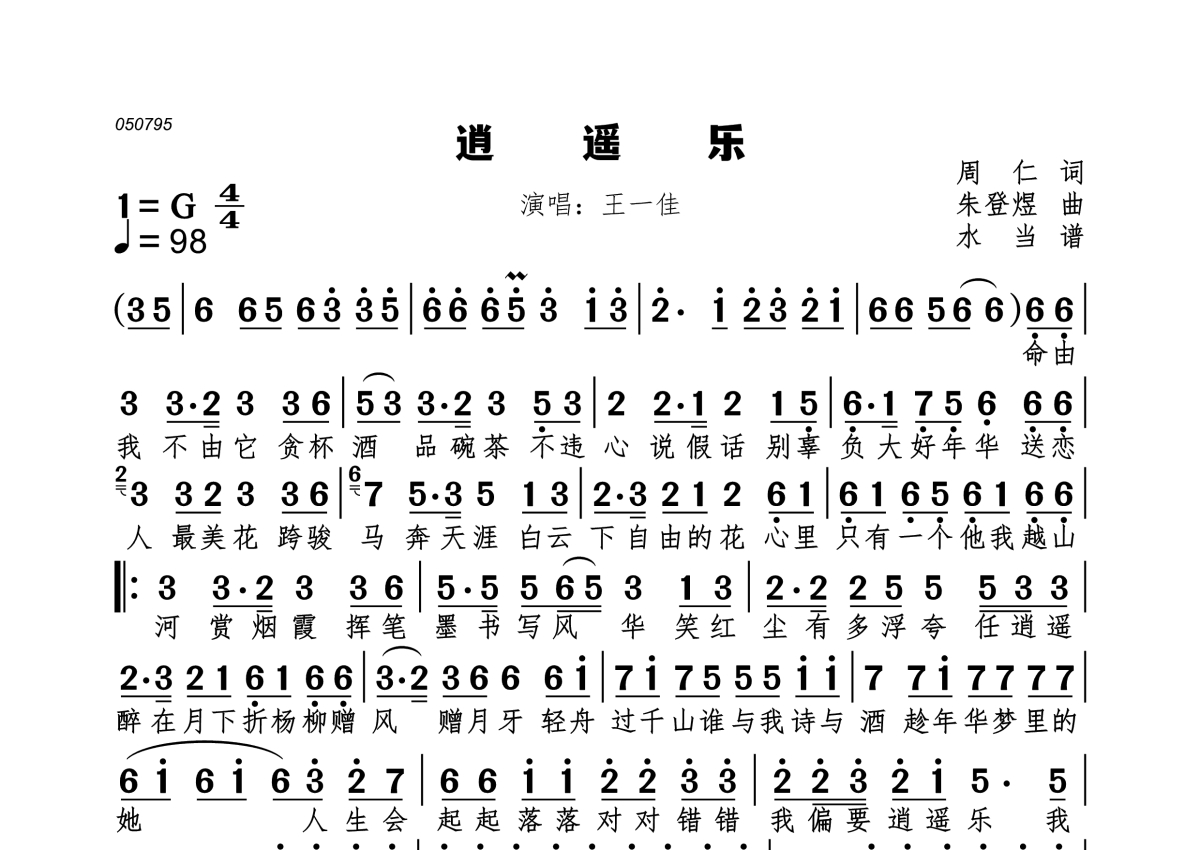 《逍遥乐》是王一佳演唱的一首歌曲,拍号为4/4拍,歌曲速度为每分钟98拍,这份简谱共有一张高清图谱,图谱由 @水当 编配上传。