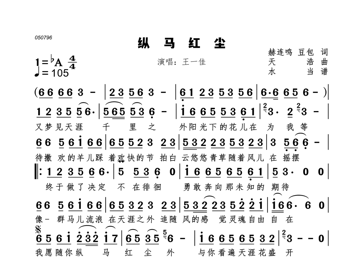 纵马红尘简谱 - 王一佳演唱