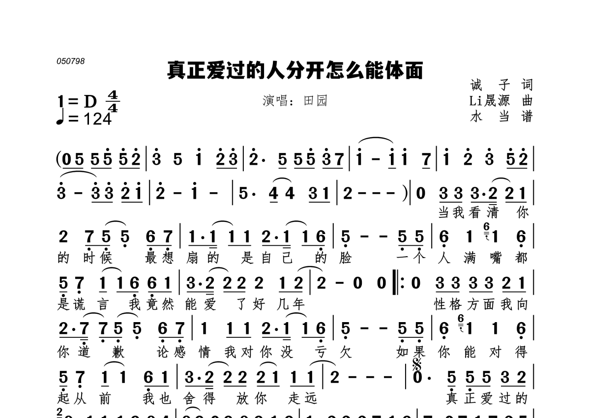 800真正爱过的人分开怎么能体面简谱 - 田园演唱