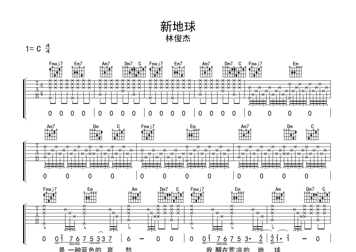 林俊杰《新地球》吉他谱 - C调弹唱六线谱