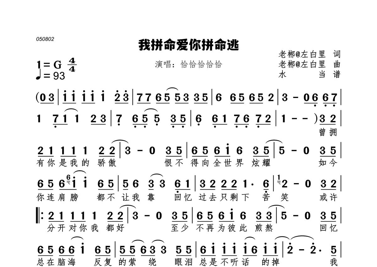 《我拼命爱你拼命逃》是恰恰恰恰恰演唱的一首歌曲,拍号为4/4拍,歌曲速度为每分钟93拍,这份简谱共有一张高清图谱,图谱由 @水当 编配上传。