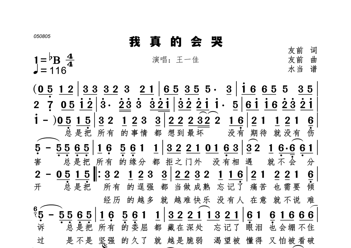 《我真的会哭》是王一佳演唱的一首歌曲,拍号为4/4拍,歌曲速度为每分钟116拍,这份简谱共有一张高清图谱,图谱由 @水当 编配上传。