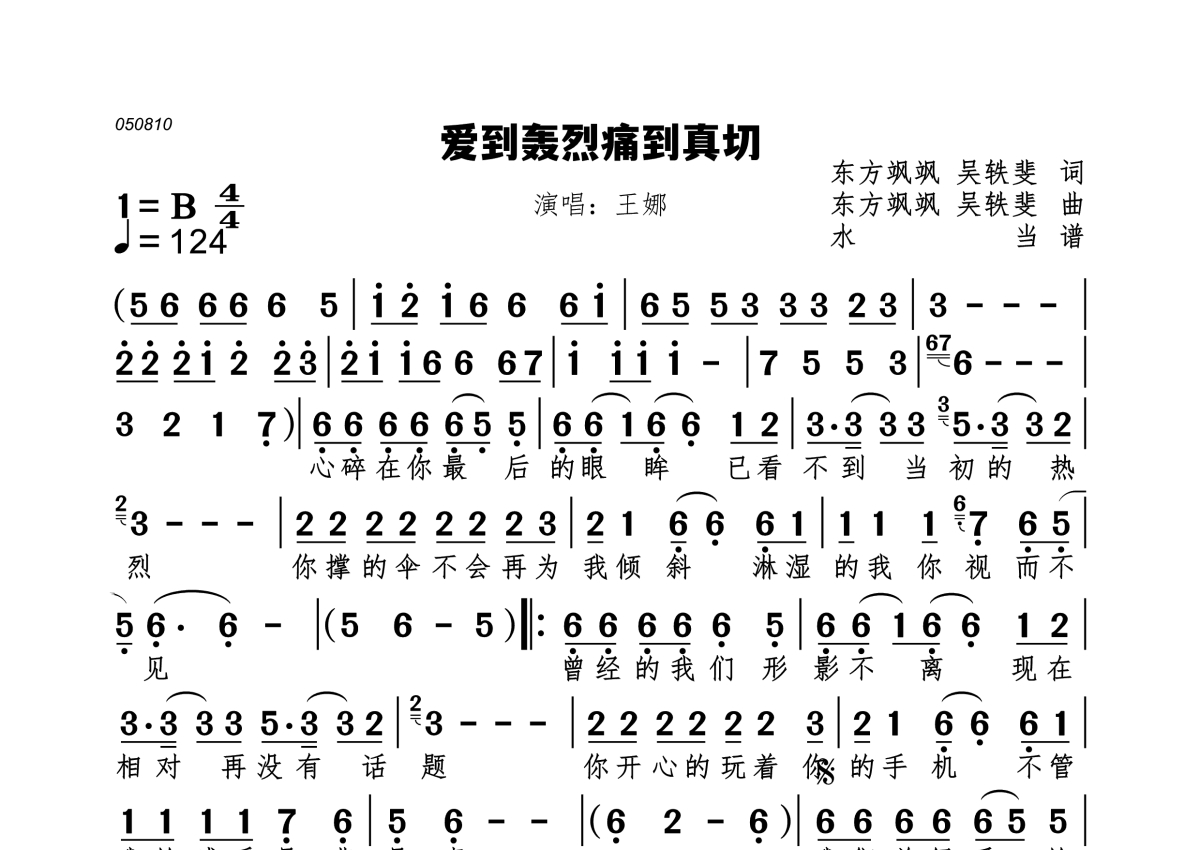 《爱到轰烈痛到真切》是王娜演唱的一首歌曲,拍号为4/4拍,歌曲速度为每分钟124拍,这份简谱共有一张高清图谱,图谱由 @水当 编配上传。