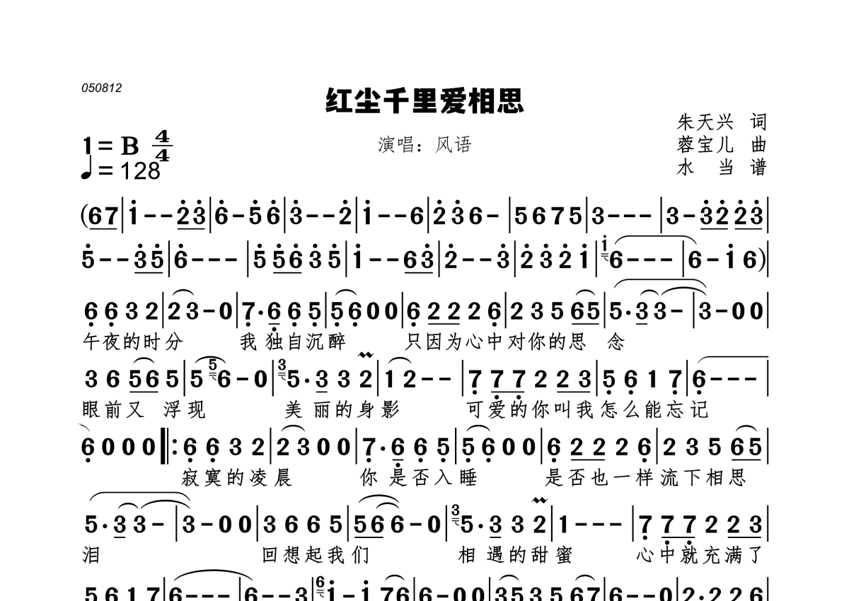 《红尘千里爱相思》是风语演唱的一首歌曲,拍号为4/4拍,歌曲速度为每分钟128拍,这份简谱共有一张高清图谱,图谱由 @水当 编配上传。