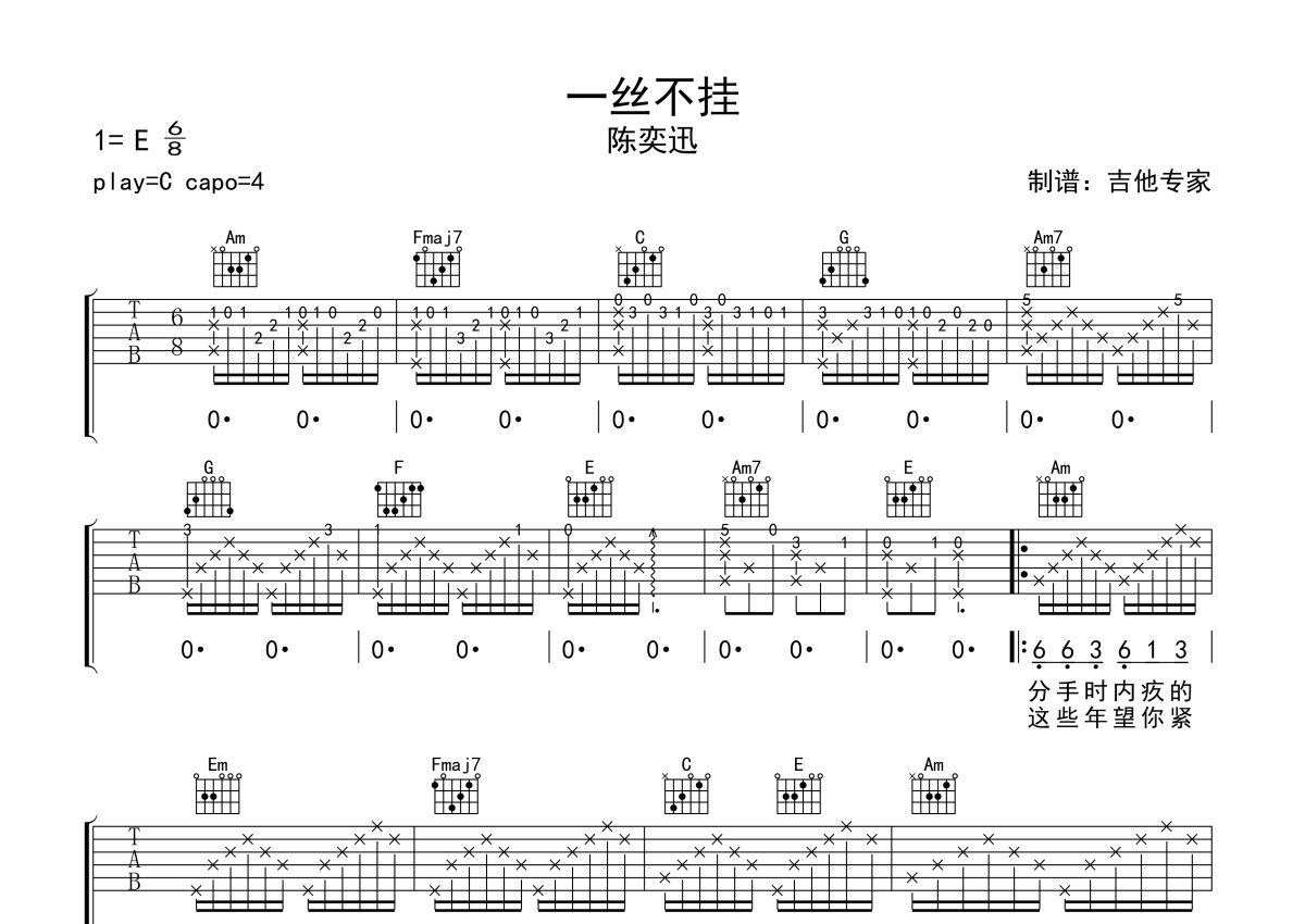 陈奕迅《一丝不挂》吉他谱 - C调弹唱六线谱